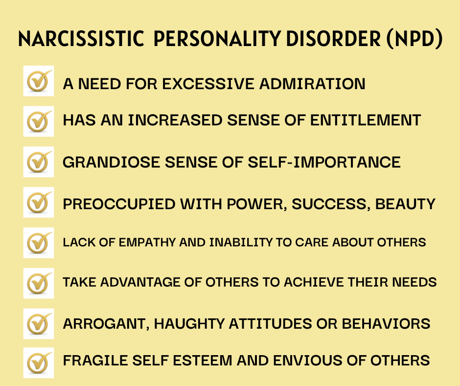 To diagnose Narcissistic Personality Disorder (NPD), a clinician needs to find at least five of the following criteria from the Diagnostic and Statistical Manual of Mental Disorders: