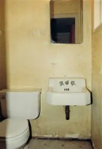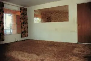 The living room curtains hung depressingly in shreds from the chipped and bent curtain rods. Those are not shadows on the carpet but the ground in grime. The side door was coated with years of dirt and heavy smoke stain. Like all the others, this room needed a thorough cleaning and new paint. The carpets and curtains had to be replaced.