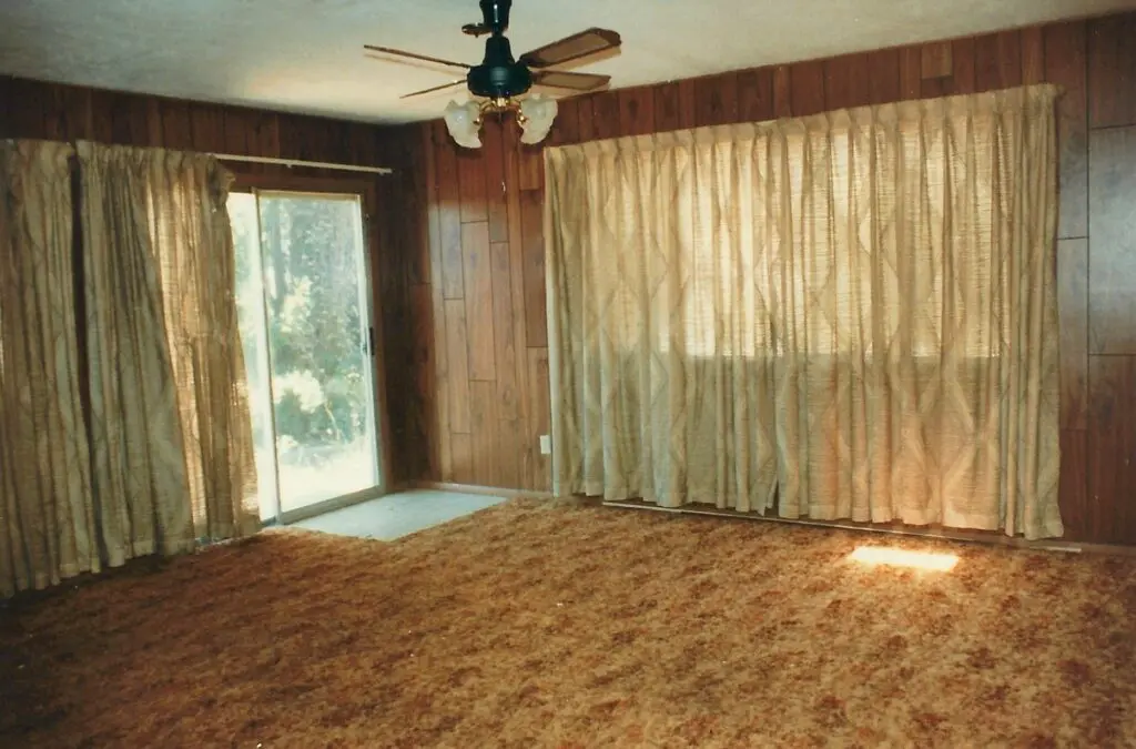 Below is a picture of the den that also had the stench, disintegrating curtains, holes in the ceiling, and worn carpet.