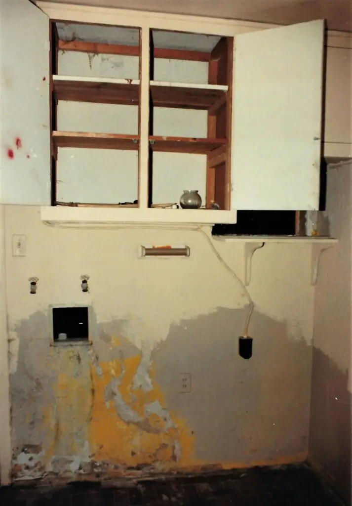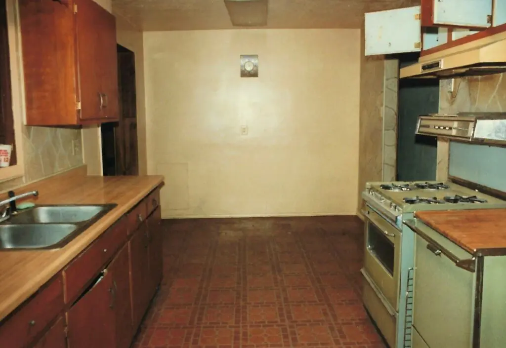 This is the kitchen. There was no refrigerator. The avocado green kitchen appliances were in bad shape. The cabinets had layers of cigarette smoke embedded in the finish. And all gas appliances had been red-tagged and were unsafe to use.
